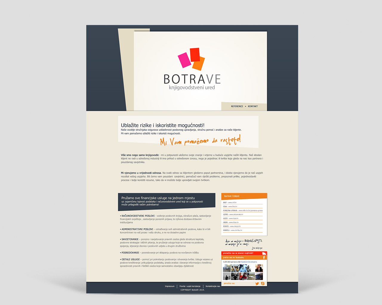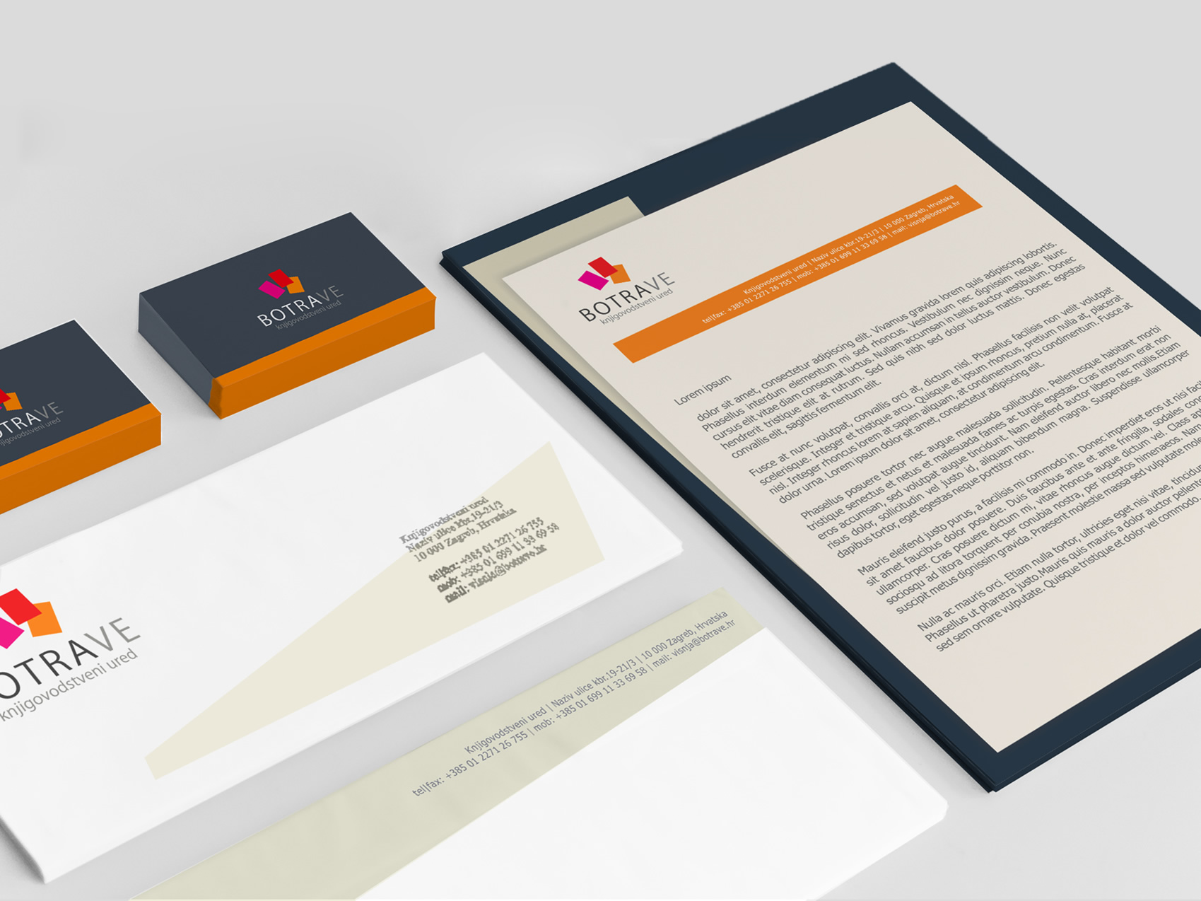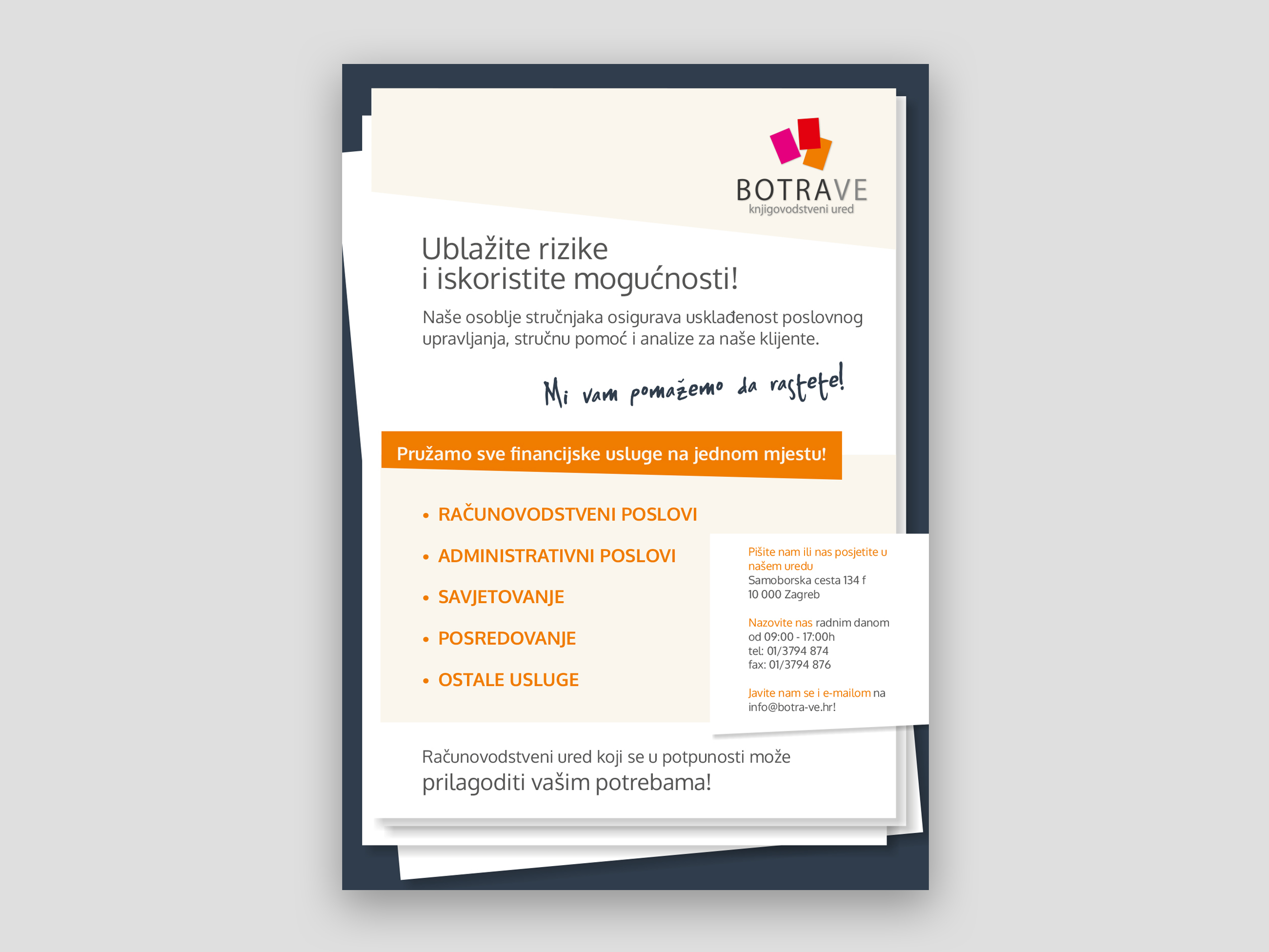 Botra-VE je mali knjigovodstveni ured iz Zagreba. Spajanjem iskustva, znanja i mladenačkog entuzijazma, osnovale su ga dvije ambiciozne poduzetnice s ciljem pružanja osobitih knjigovodstvenih i savjetodavnih usluga. Naša ideja bila je stvoriti im vizualni identitet modernog, jednostavnog i čistog dizajna (kako znaka, tako i tipografije) s upotrebljenim bojama koje nedvosmisleno aludiraju da u pozadini cijele priče stoji pristup radu okarakteriziran mladenačkim žarom i ženskom notom. (Kao da smo morali malo aludirati na sebe :)