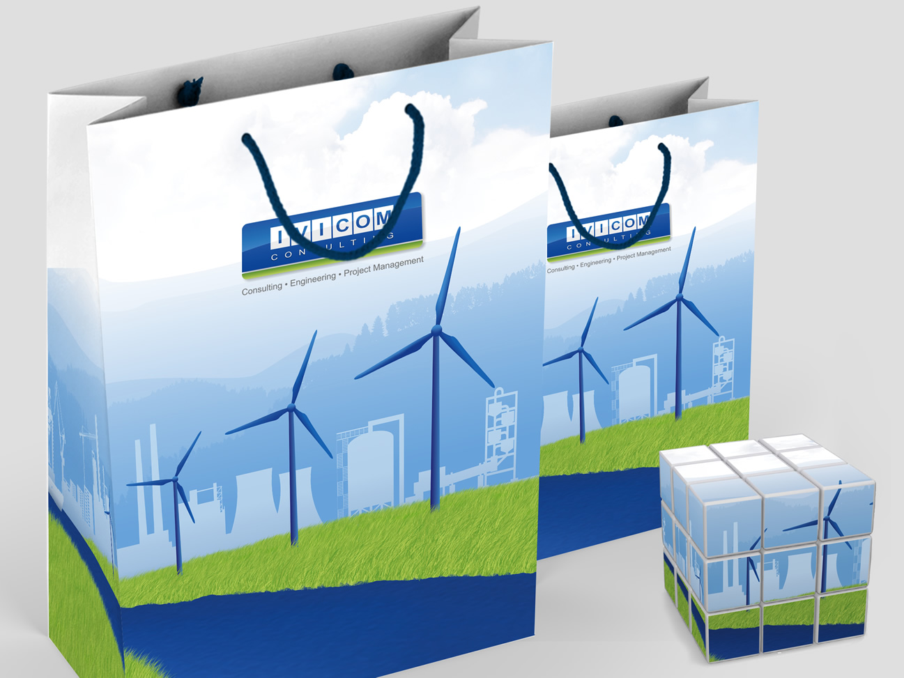 Our solutions for Ivicom's visuals are coloristically connected to their existed logo. Technical typography that was used leans to their engineering working fields, and among applied illustrations that clearly describe their professional activities, a lovely grass is blended to emphasize their environmental awareness.
