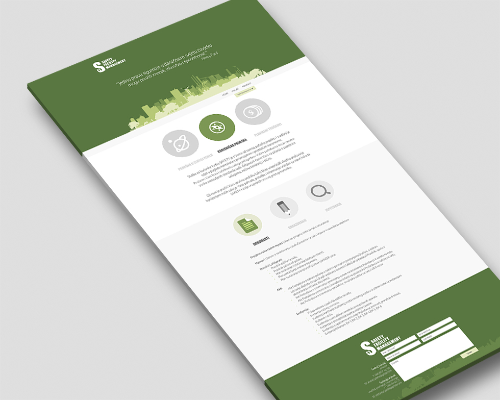 I, eto, točno takav one-pager smo im onda i napravili! Počevši od tehnički čistog layouta, preko strukturnih elemenata koji ništa ne filozofiraju pa sve do kolorističkog minimalizma zelene (to je simbolike radi :) nastao je moderan i pouzdan i potpuno user-friendly Safety web.